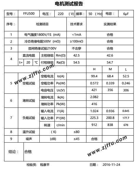 當(dāng)前位置:首頁 >> 新聞咨詢 >> FFU500電機(jī)測試報(bào)告FFU500電機(jī)測試報(bào)告 型號(hào):FFU500 電壓:220 (V) 頻率:50 (Hz) 電容:6mF 1、檢測項(xiàng)目:電氣強(qiáng)度1800V/1S (mA);技術(shù)要求:<1mA;實(shí)測結(jié)果:合格。 2、檢測項(xiàng)目:冷態(tài)絕緣電阻500V (mQ);技術(shù)要求:>100mQ;實(shí)測結(jié)果:合格。 3、檢測項(xiàng)目:匝間絕緣試驗(yàn)2100V;技術(shù)要求:不擊穿;實(shí)測結(jié)果:合 …
