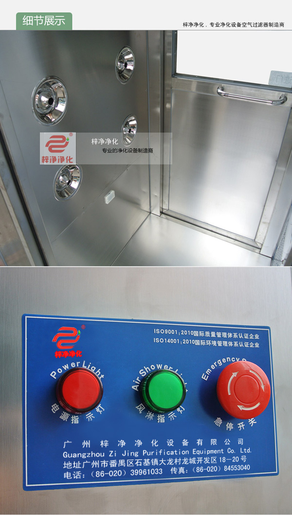 工作原理:用于人員出入,防止不潔凈氣流進(jìn)入潔凈區(qū),工作區(qū)內(nèi)設(shè)置吹淋凈化處理裝置,消除人、物表面附著塵埃,同時(shí)具有氣閘作用,配合潔凈空調(diào)系統(tǒng)確保潔凈室達(dá)到所需潔凈度。