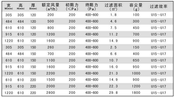 U15無隔板超高效過濾器技術(shù)參數(shù)